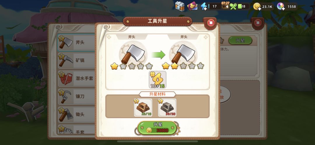 我们来算一下悠长假期,升级一个二星工具需要多少金币和体力