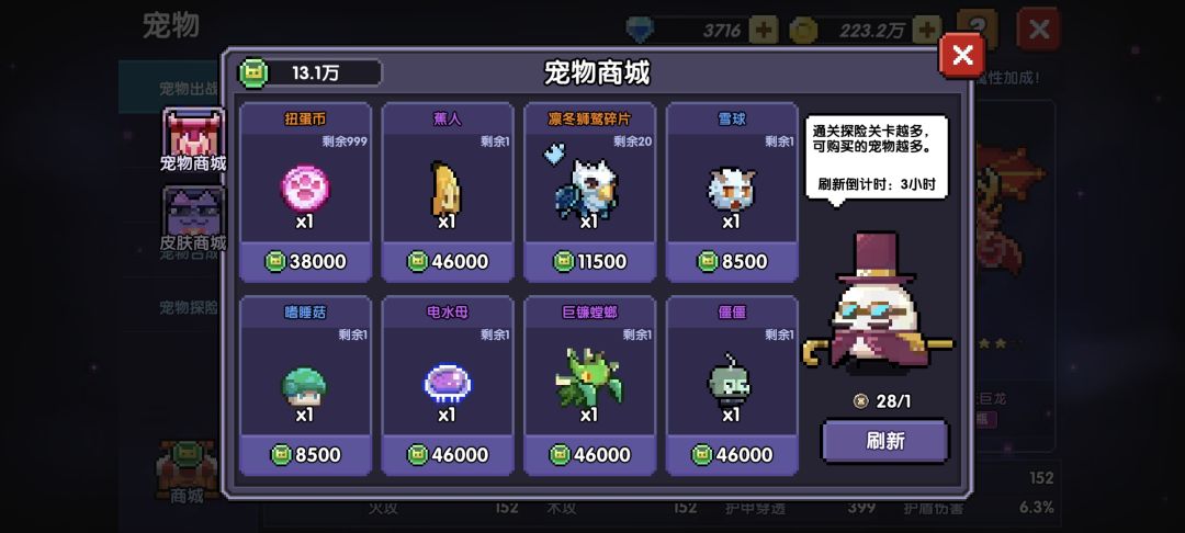 3.宠物界面的左下角有个商城,如果你急着要特定的普通宠物(紫橙属性的),那你可以直接买,但大部分情况我推荐你只买扭蛋币(大狗粮又贵经验又少——来自某个大冤种)