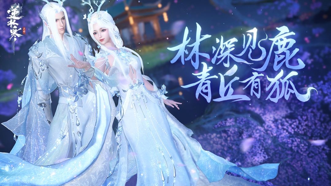 月明清辉双鹿隐,苍风瑶羽林中仙。头饰【踏莎行】将鹿角用冰雪重新演绎,鹿角间花蕊绽放,蝴蝶轻颤,取一路生花之意,是灵鹿为主人赠予的好运与福气~这个传说中从天上瑶光星散开的星尘中而生的瑞兽,就要跃然于逆水寒同门们的衣裙之上了!