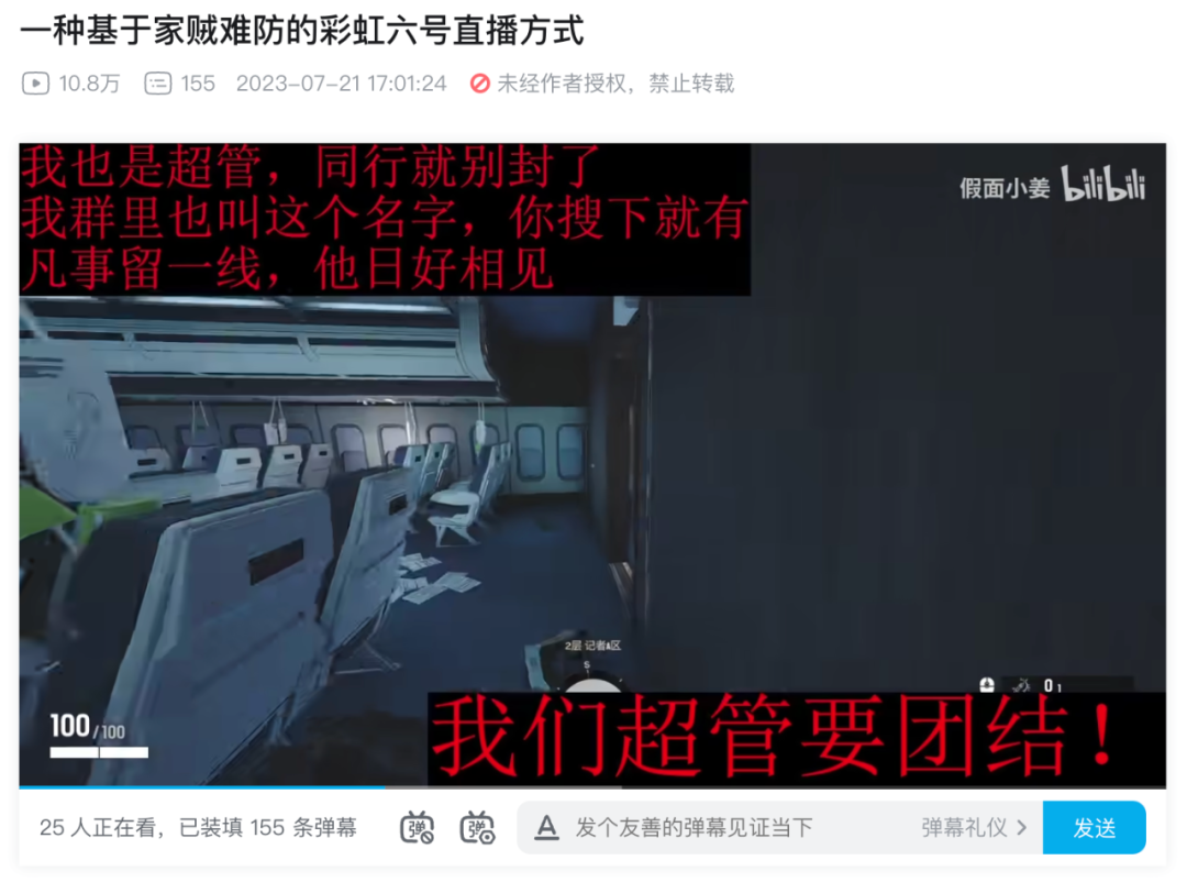 于是这位主播找了和彩六在画面和玩法上非常相似的游戏《严阵以待》直播,并覆盖上彩六的UI,结果真的被封禁了,这说是教科书级别的互动性行为艺术我想没人会反对吧?