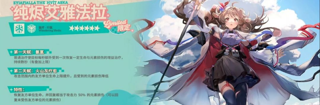 预计技力55,攻击力提升50%,范围内友方每秒回复10%攻击力元素损伤。(损伤回复效率可能更高)