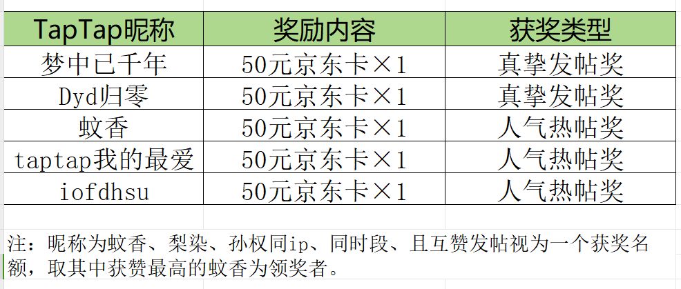 1、中奖的玩家请添加官方Q群864202635,找管理员“冰月小助理”进行领奖,届时需提供获奖发帖截图和tapID、昵称截图,进行信息核对,确认无误后,即可领取奖励。