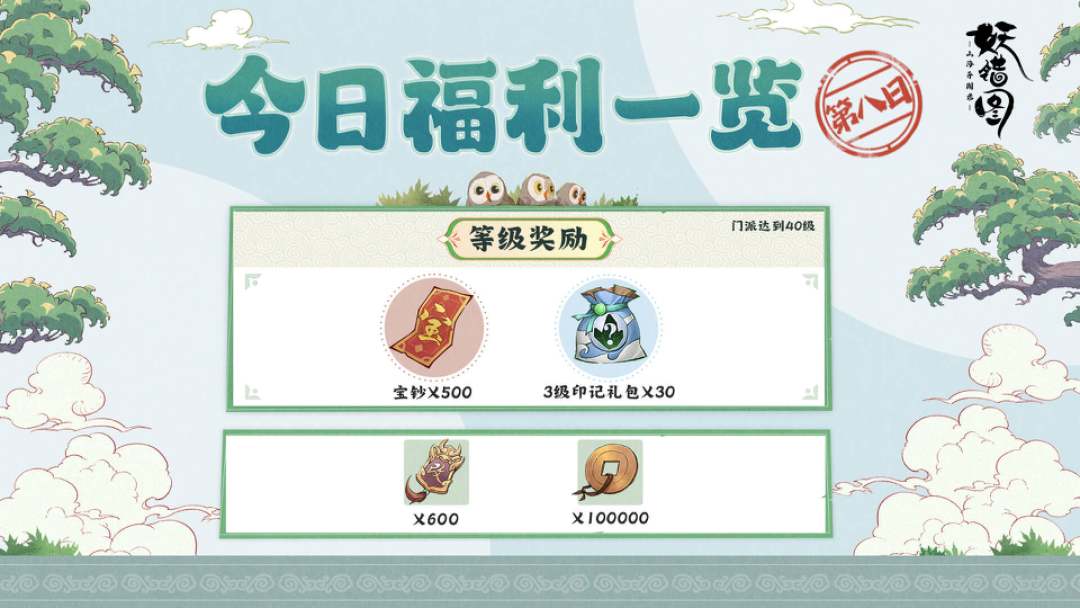 今日门派达到上限的掌门可以获得500宝钞与3级印记礼包,还有600个改命券和10万铜币哦!