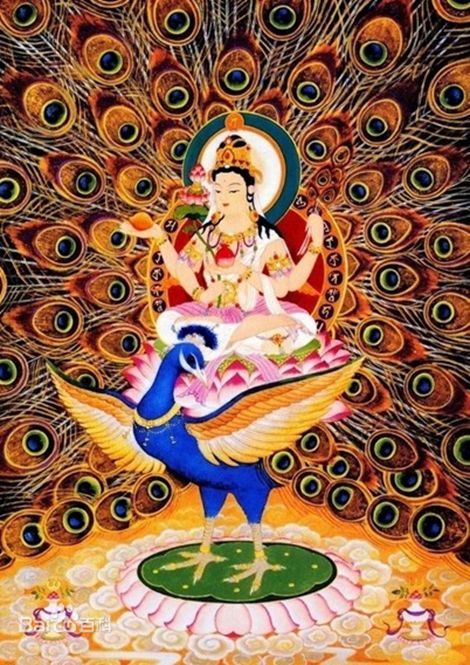 汉代之后,随着佛教的传入,孔雀明王的信仰和传说更进一步强化了人们对孔雀神性的感知。据印度《孔雀明王经》记载,孔雀明王是佛陀的“等流身”之一。佛家认为,佛显现成什么样子,没有固定的规律,有时候佛显示为人的身形,有的时候显示为天的身形,有的时候显示为鬼的身形,有的时候显示为畜生的身形,而“孔雀明王”便是其一。