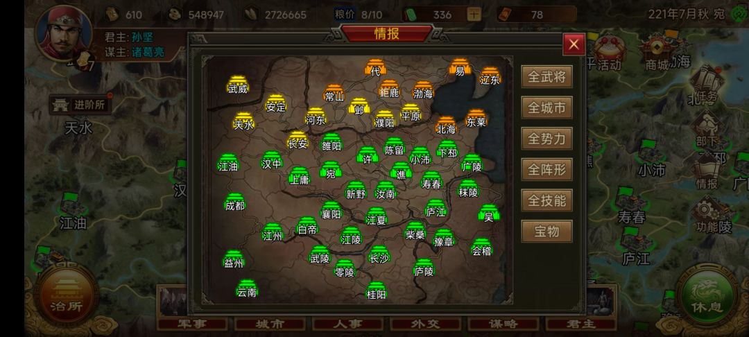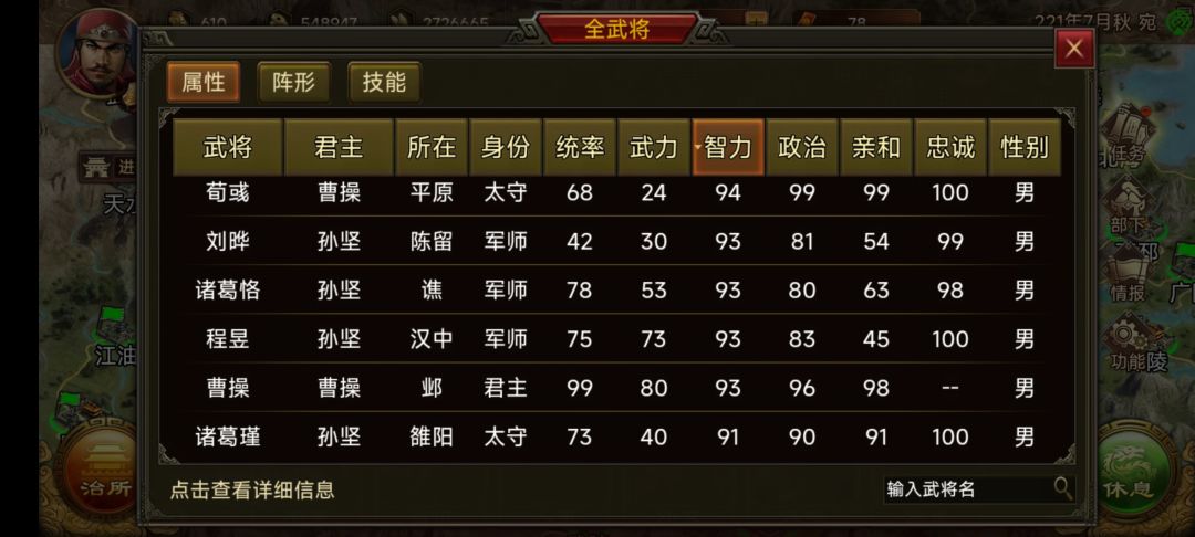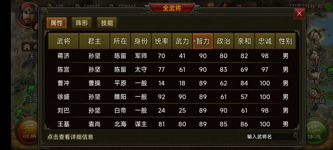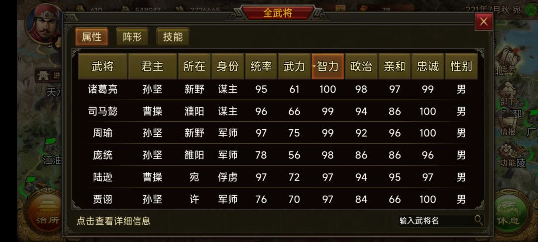五,这个游戏军师是最重要的,后期智力低的武将打仗毫无作用,而是用在其他地方。军师多才能打胜。军师的来源主要有两种,一是挖忠诚度低的将,二是俘虏。