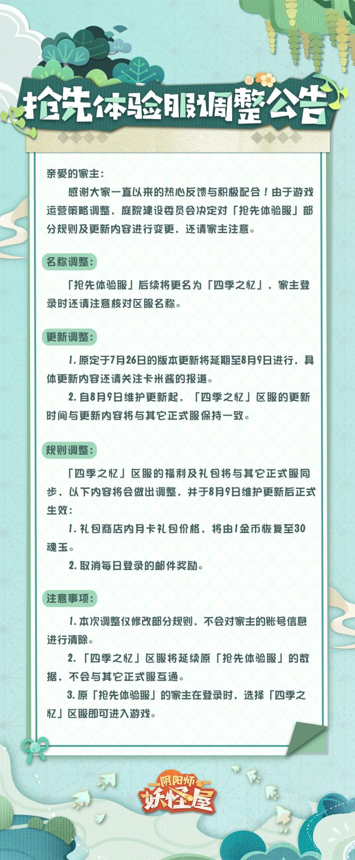 「抢先体验服」后续将更名为「四季之忆」,家主登录时还请注意核对区服名称。