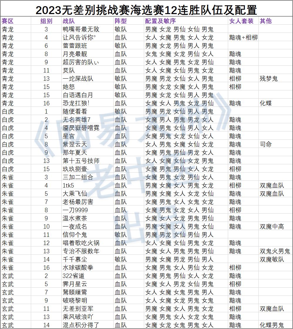 两个明星战队在无差别中都不约而同的抛弃的敏队配置,可见新版八阵图2.0系统对战斗格局的改变之大。同时,召唤兽佩饰系统的加入也增强的召唤兽的站桩能力,从而进一步提升了血队的站桩能力。海选赛赛程已经过半,这里统计了目前12连胜的队伍及阵型配置: