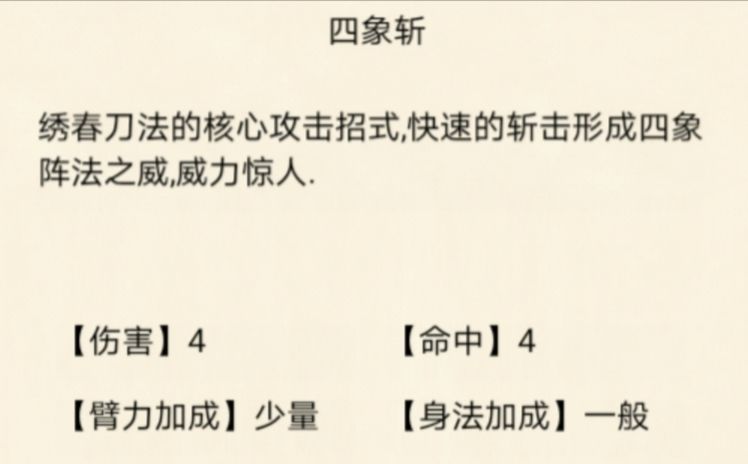 【四象斩】:普通直伤绝招,面板较高加层很低,伤害一般。