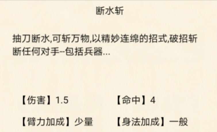 【断水斩】:无法被格挡的直伤型绝招,命中目标可缴械目标,伤害极低。