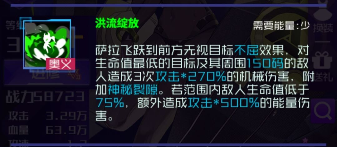萨拉第二次普攻和技能会给单个目标施加神秘裂隙,使其每秒受到伤害且减少2点奥义能量。奥义则会给全体目标施加神秘裂隙,相当于烟花棒生效两次,减能效果相当可观。