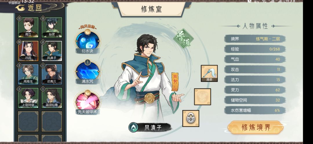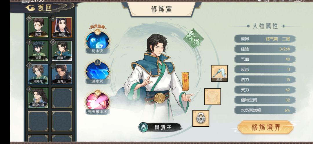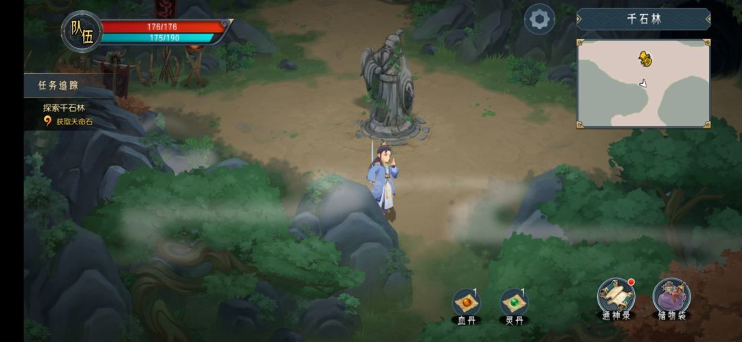 进第二个关卡之前先去无名遗迹做了个伤害测试,就是教学关卡,初始给的三个秘籍,初始三个英雄,还有抽卡第一抽必出的英雄,只给小师妹升了两层修为