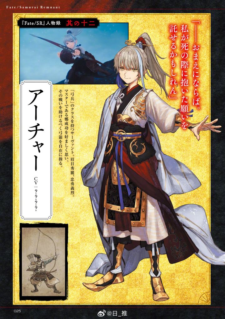 和身为御主的郑成功意气相投,为了在那场战斗(圣杯战争)中帮助他而自如的操使弓箭。
