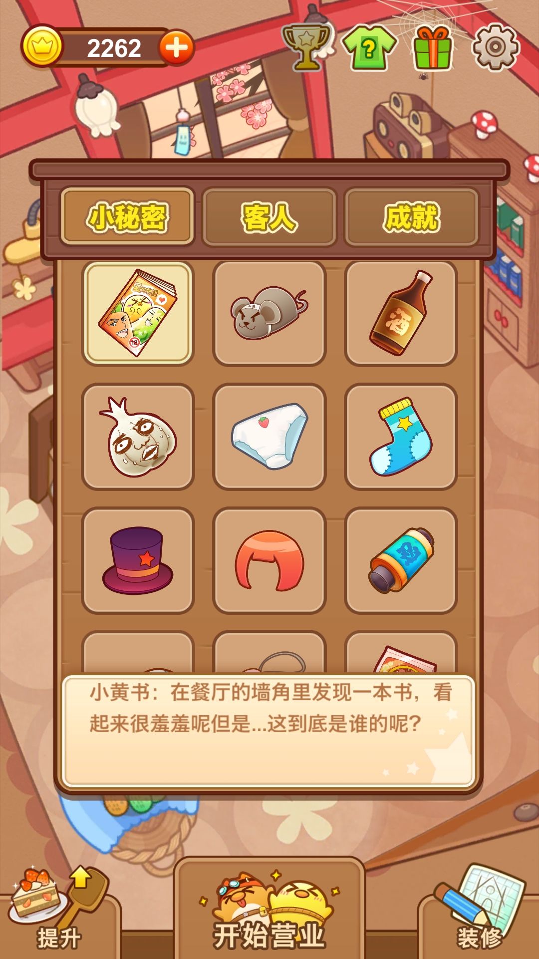 收集品很好收集,这里面有几个小秘密不容易被找到,原因在于它们一开始不会出现,过一段时间后才会在餐厅的各个角落显现,所以这里有一个小技巧,在接待最后几个客人时,故意不给他们饭,留下时间专门找收集品,这个时候小秘密会全部出现,眼睛实在看不到,就用穷举法,把餐厅各个角落全部点一遍,肯定能找得到