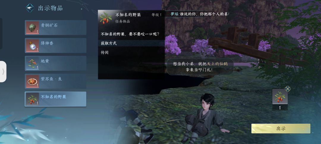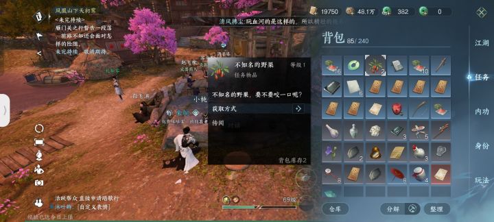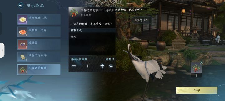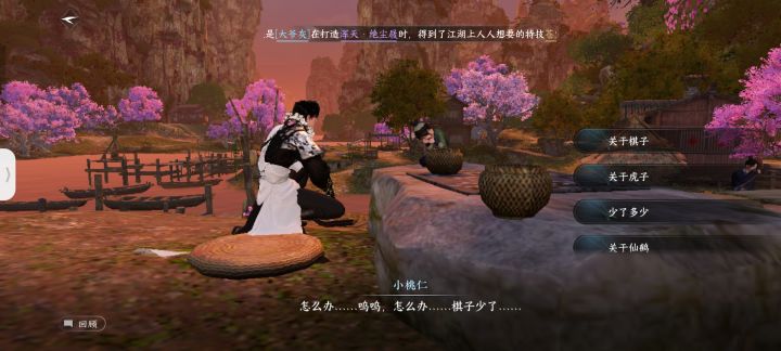 桃溪村的虎子大家都知道去汴京找猫然后买不知名的果子,可是有更快的方法就在去三清山的仙鹤对面有个小桃仁,回答他的问题他就直接给你俩不知名的野果,一颗喂三清山的仙鹤一颗给虎子,简简单单就搞定了。