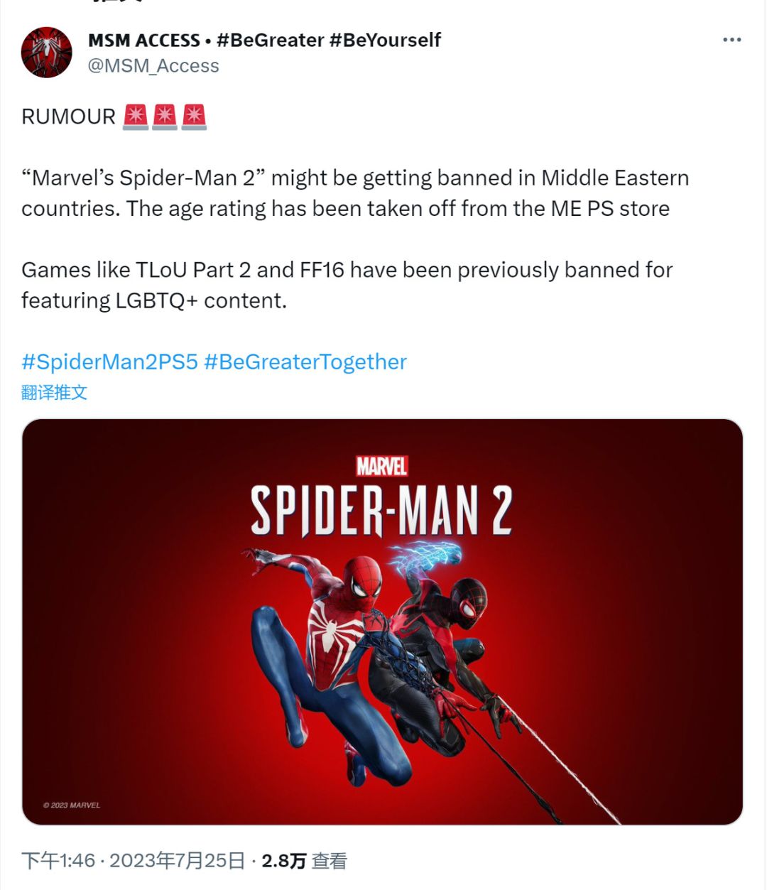 继《最终幻想16》和《最后的生还者2》后,《漫威蜘蛛侠2》可能将是下一个被禁止在中东国家发售的大作。