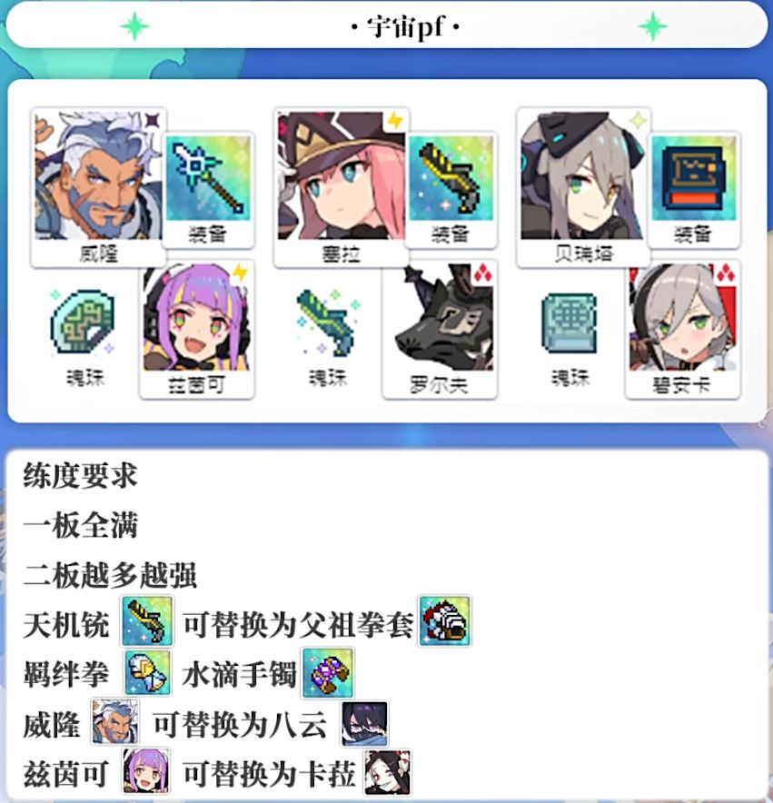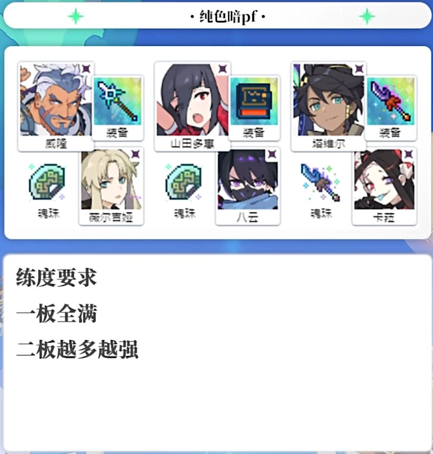 同暗直寄一样,PF表现也不错,但是由于暗属性的纯色PF队伍有一种残缺的美,所以更推荐使用宇宙PF。