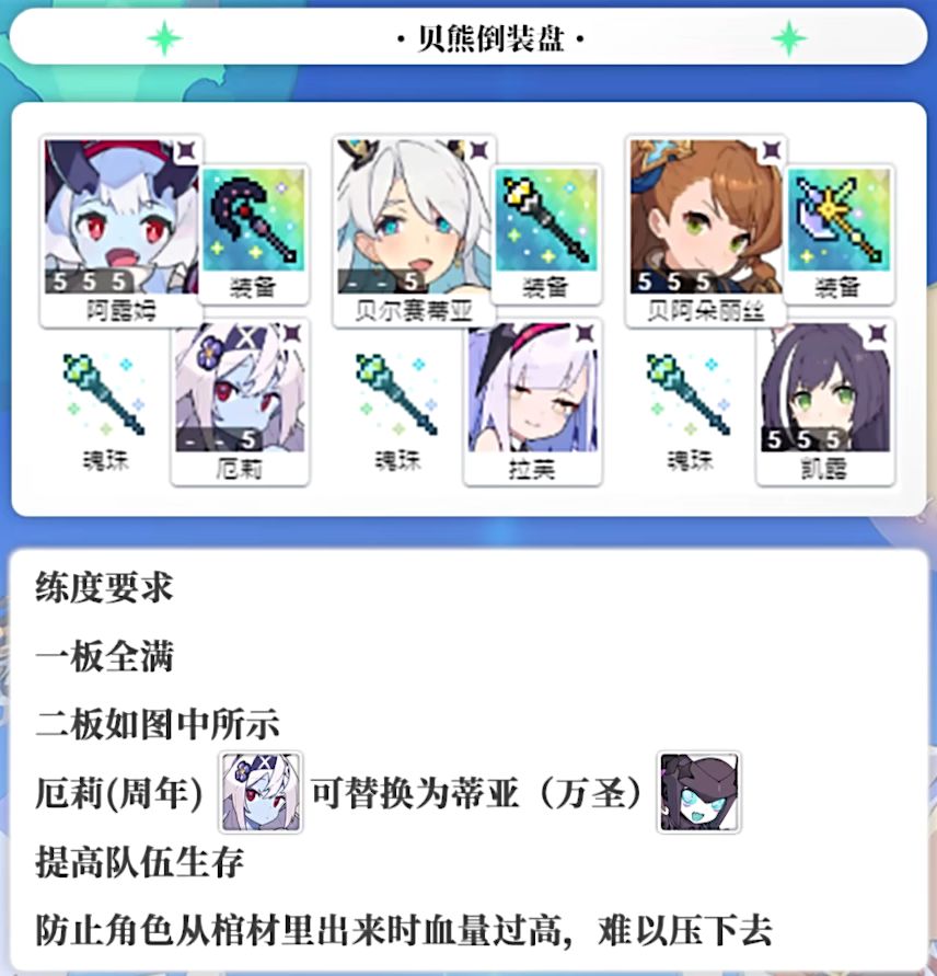 练度要求中要二版充能点满但是点不满的小伙伴可以尝试把礼铳放队长位卡充能对上第一波轴。