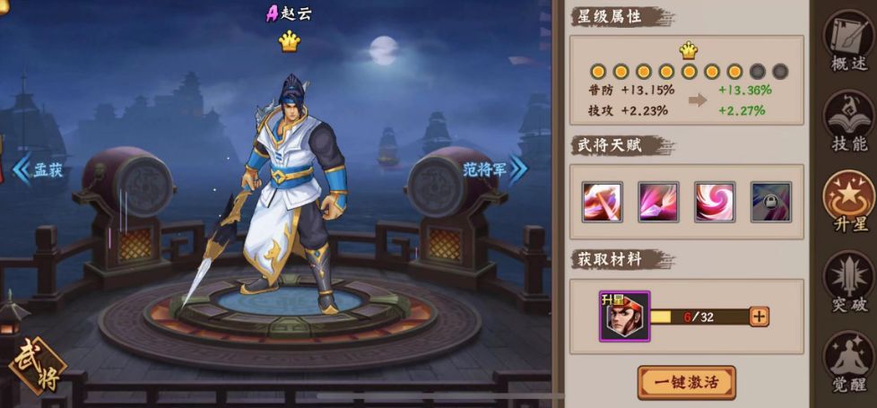 赵云是入游戏即送的A将,他有四点较为明显的优势:一是冲刺姿势为举着长矛向前突进,冲刺距离长;二是升星卡相对比较容易获取,升星门槛较低;三是开启一冠天赋后,赵云的三技能可以多出二段的远距离伤害。所以,赵云是一个特色虽不鲜明,但极易入手且操作难度低的一个武将;四是辅升星属性为技攻,较为实用。