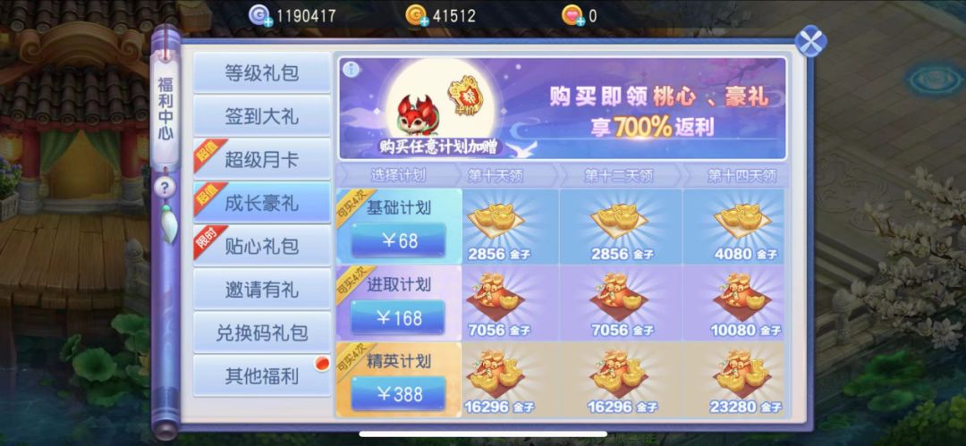 充值对应的计划,可以在接下来的14天里,每天领取对应的奖励,可以获得大量桃心和金币。