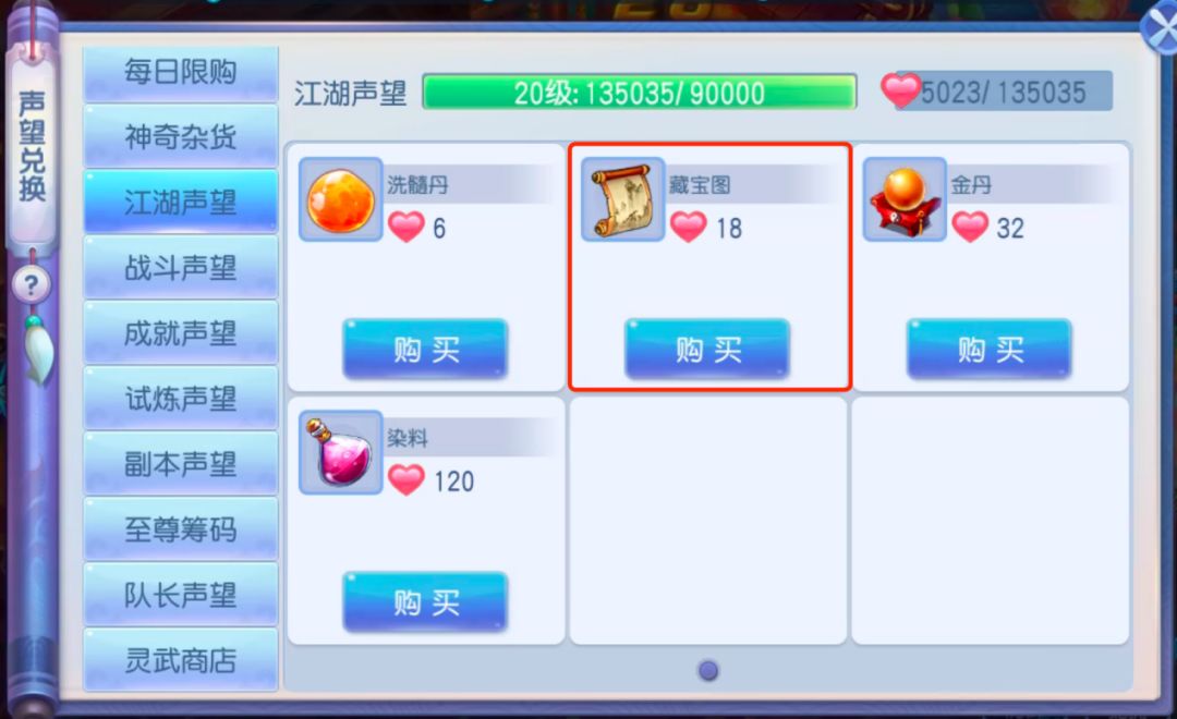 可以在江湖声望中,换取藏宝图,通过增加挖图次数增加物品获得数量,从而达到获取金币的效果。