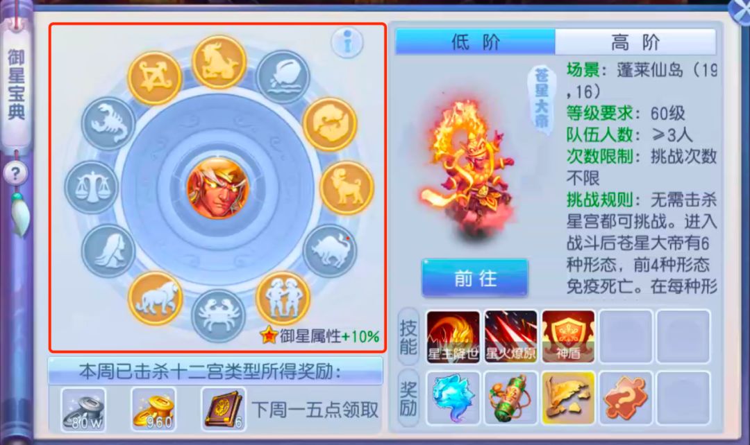 俗称12星座或者45。通过挑战12星座可以获得价值不菲的物品奖励,小编曾经获得过一本观音送子图,价值19800金币。12星座与大帝挑战相关,同时可以查看本周12星座是否全部打满。