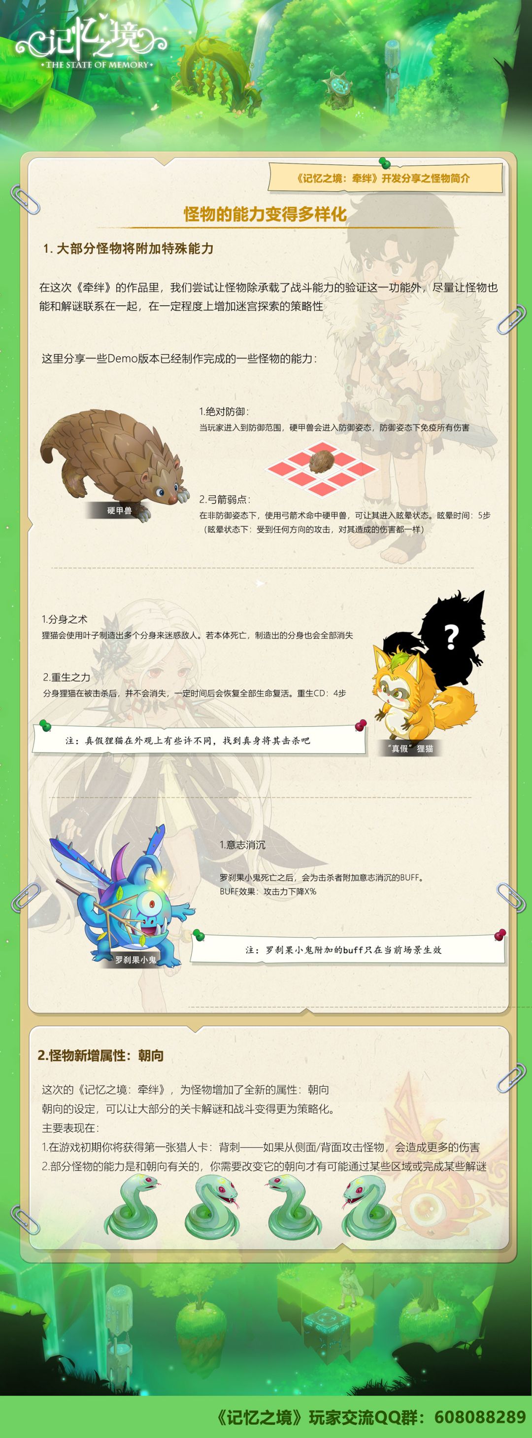 《记忆之境:牵绊》是一款迷宫探索类的角色扮演游戏,游戏以解谜成长为主基调,以策略战斗为辅。本作将带给你一场有趣的迷宫探险之旅。本次的游戏介绍主要是讲一下怪物的设计~