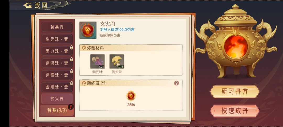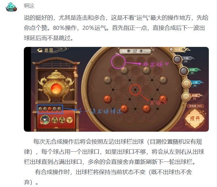 现版本的炼丹是真的难,总步数20步,辅助人物就一个开局白送的小师妹,前期还挺简单,但后面的丹药动不动就要合成456级的丹药,而且还是四五颗,真的太难了。