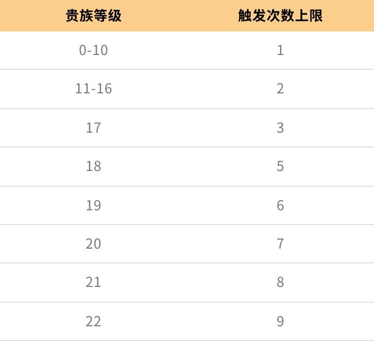 1、现在瞒天过海技能中“减少山河破碎头像负面状态时间”不再为无限触发,而调整为每天0点重置触发上限,每日触发次数根据贵族等级有上限,详情如下: