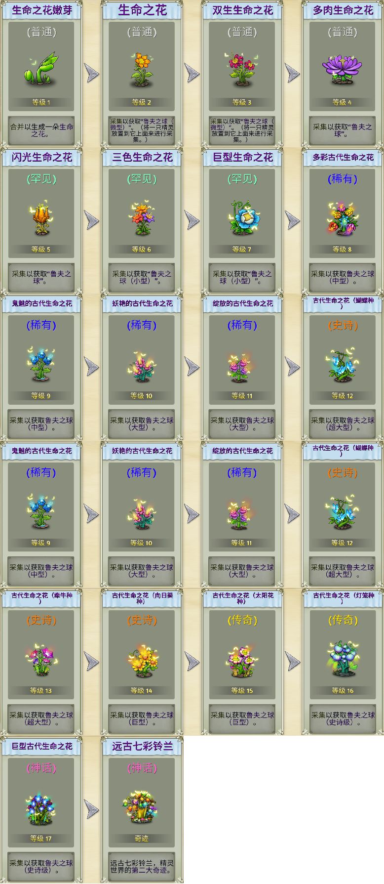 生命之花种子 → 生命之花嫩芽-等级1 → 生命之花-等级2 → 双生生命发之花-等级3 → 多肉生命之花-等级4 → 闪光生命之花-等级5 → 三色生命之花-等级6 → 巨型生命之花-等级7 → 多彩古代生命之花-等级8 → 鬼魅的古代生命之花-等级9 → 妖艳的古代生命之花-等级10 → 绽放的古代生命之花-等级11 → 古代生命之花(蝴蝶种)-等级12 → 古代生命之花(牵牛种)-等级13 → 古代生命之花(向日癸种)-等级14 → 古代生命之花(太阳花种)-等级15 → 古代生命之花(灯笼种)-等级16 → 古代生命之花-等级17 → 远古七彩铃兰