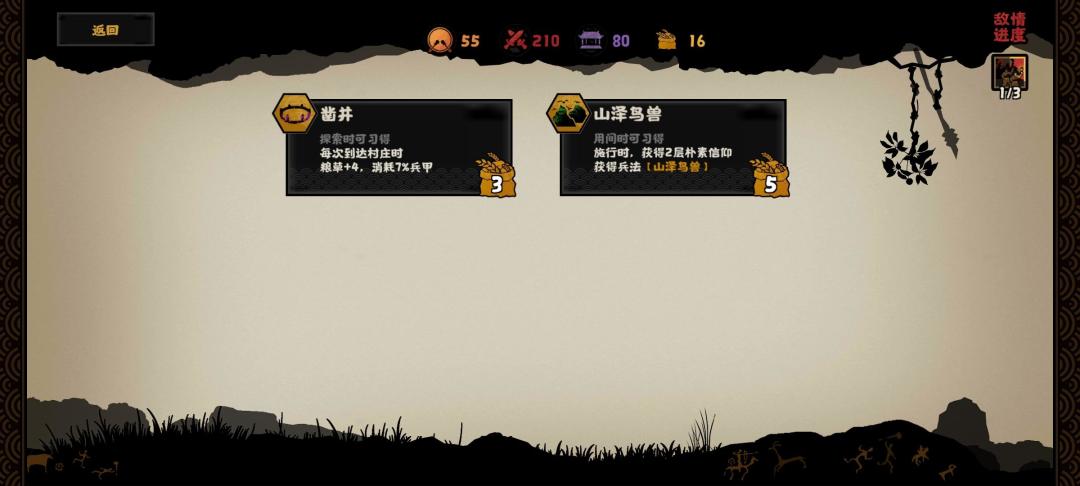 凿井技能:到达村庄获得4粮草,但是会消耗掉7%的兵甲。该技能通过探索进行解锁,需要消耗3粮草方可解锁凿井技能。而这个技能的解锁通过探索获取,其实际解锁技能粮草远远不止3粮草,甚至你还会被套上一堆负面buff,并且你到达村庄还会减少7%的兵力,在我看来无疑是入不敷出,较为亏本的生意。