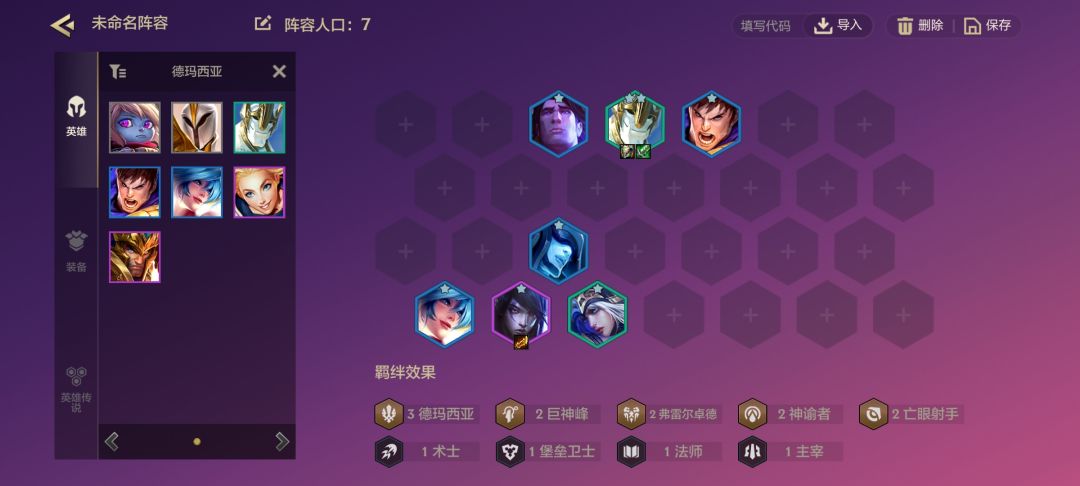 凑德玛西亚羁绊因为前排会给个光明装备,皇子不来前排直接盖伦、加里奥、琴女(波比、天使),然后必须要的羁绊是弗雷尔卓德,猪妹没来就冰女+-寒冰。