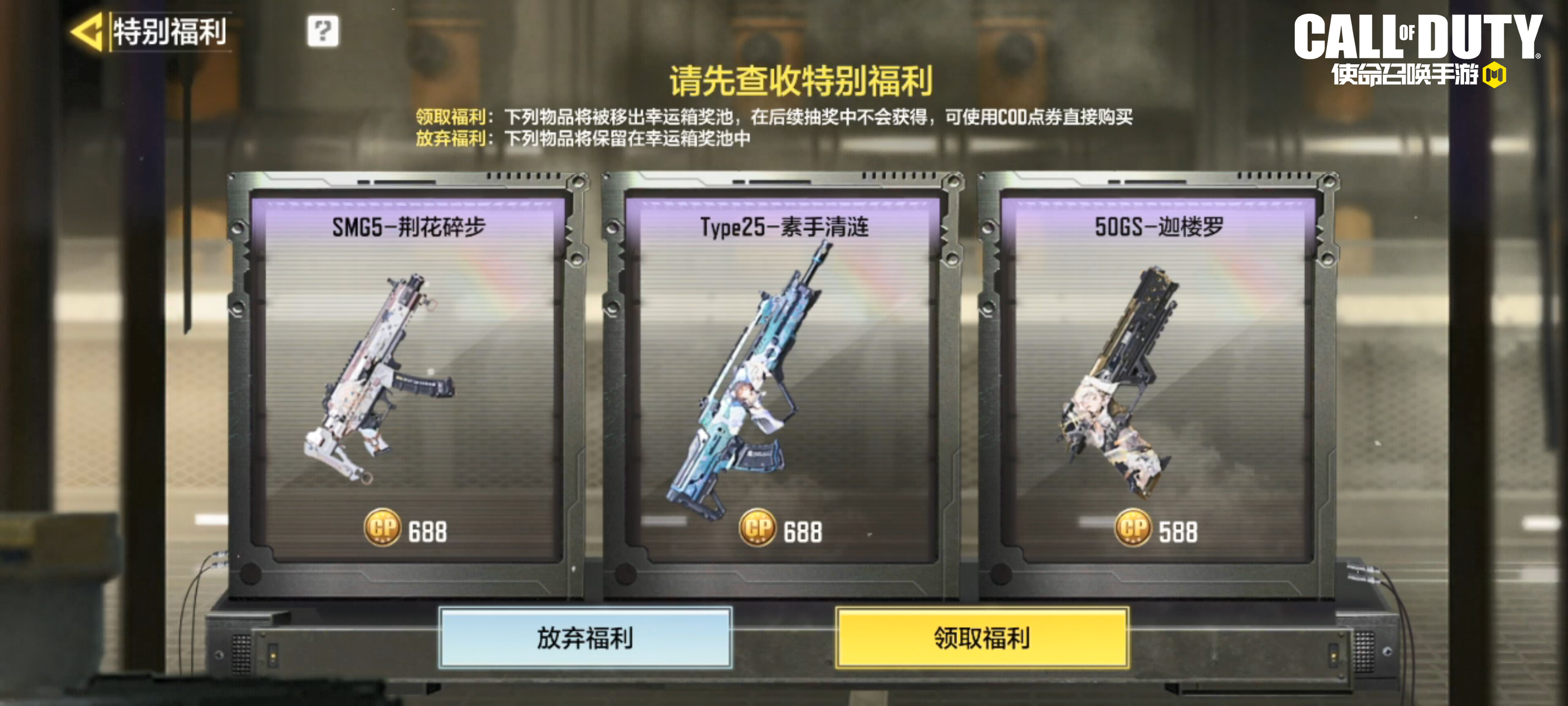 战士们选择“领取福利”后,对应的同枪型武器将会被移出异界重奏幸运箱奖池,战士们可以选择用COD点券直接购买。