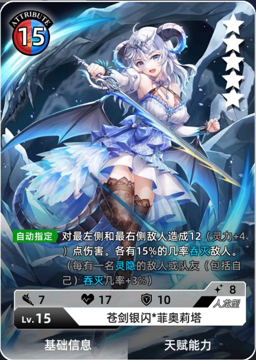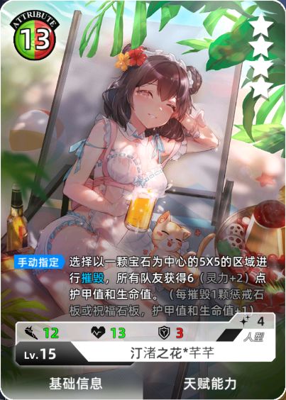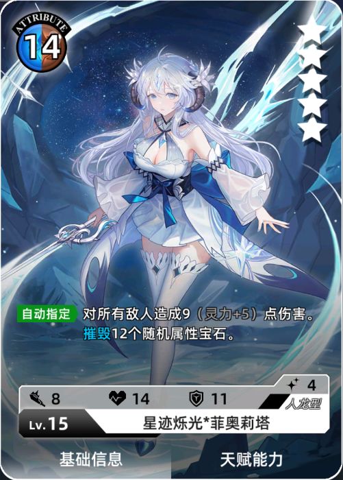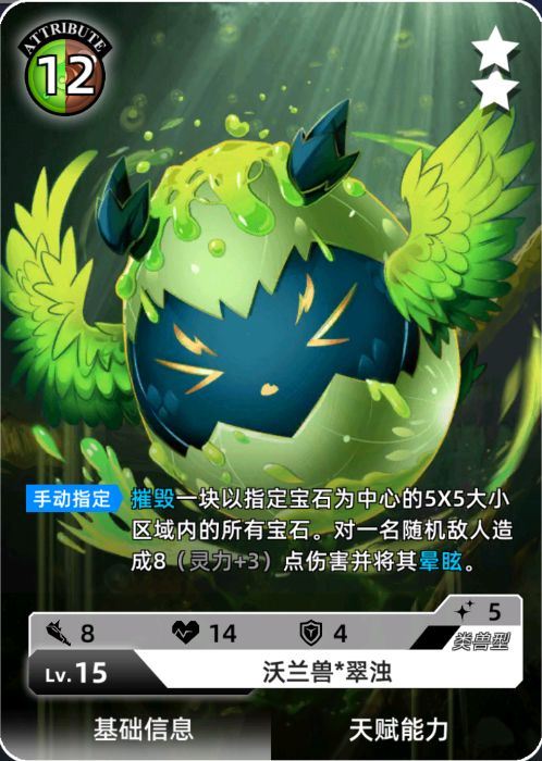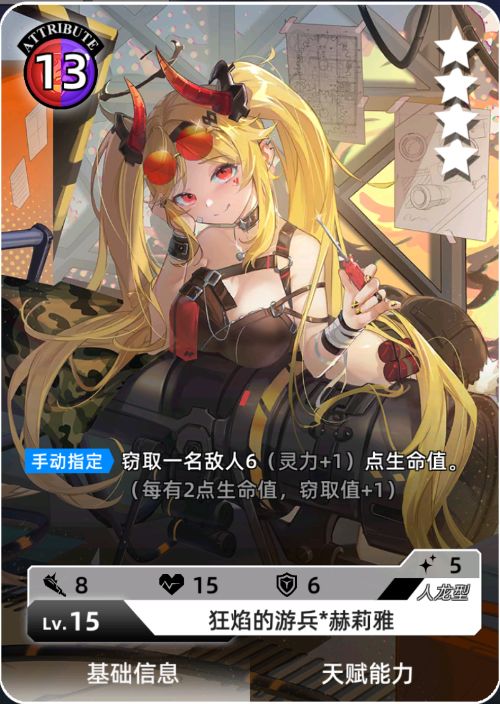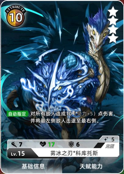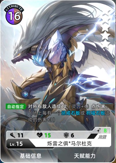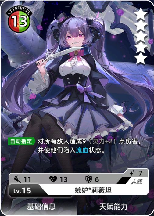 魂器本能选的四星里实在没有几张好用的输出卡,这张还算能看。虽然技能数值不算特别高,但是天赋好(开局满能,匹配光加1能量),总能量也只要10点。没有选到好用的输出卡就选它吧。