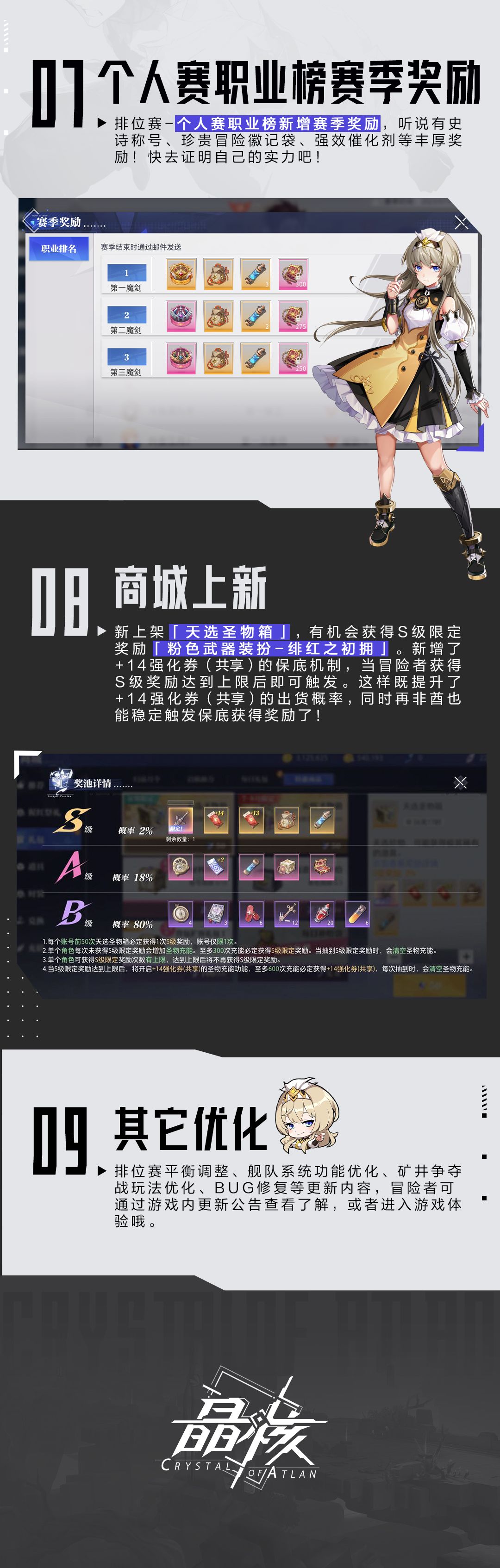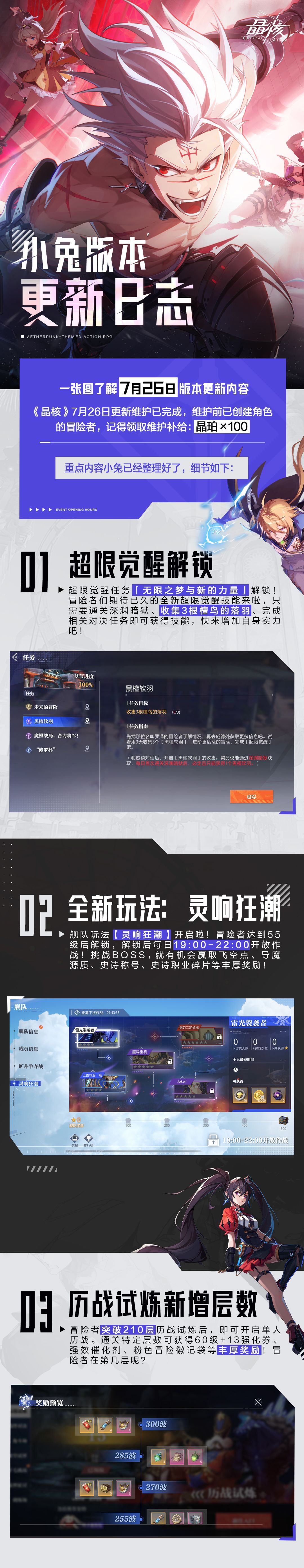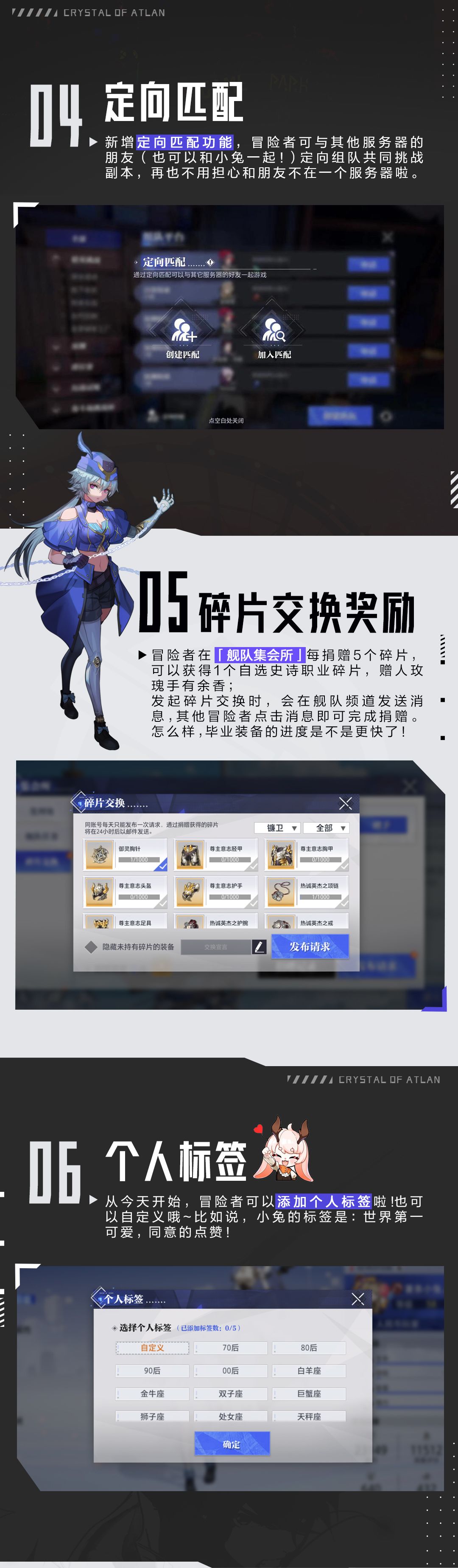 全职业的超限觉醒解锁、全新玩法【灵响狂潮】来临、历战试炼新层数更新,还有冒险者们期待已久的定向匹配、碎片交换奖励、个人标签等上线,欢迎大家体验!