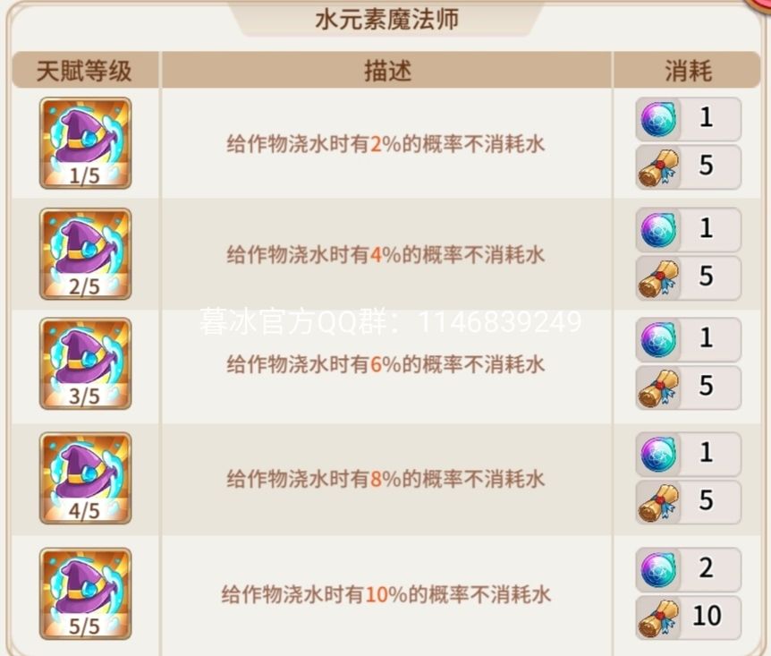 ①水元素魔法师:5级,给农作物浇水时最高有10%的概率不消耗水