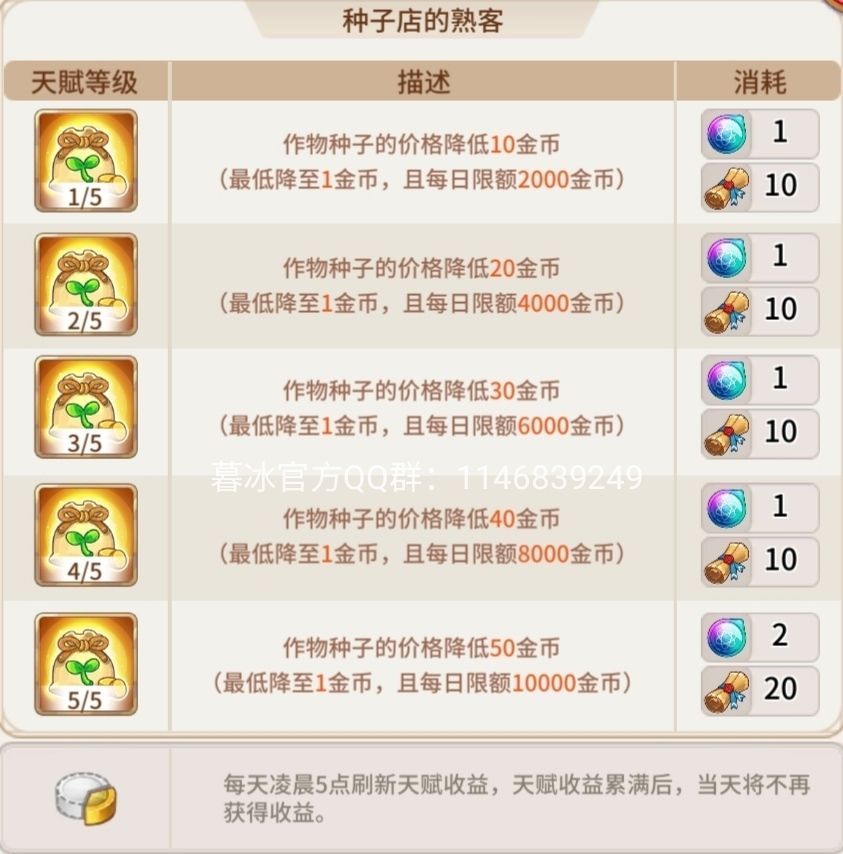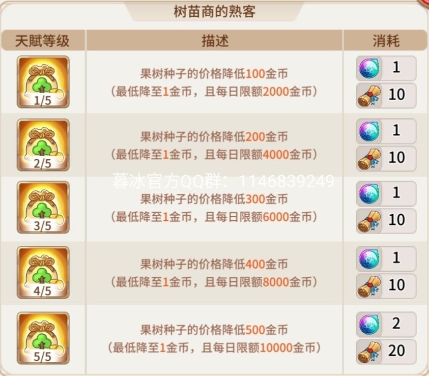 ③树苗商的熟客:5级,所有果树的种子价格降低500(最低降到1,每日限额1万金币)