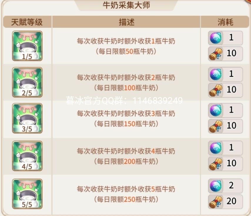 ②牛奶采集大师:5级,每次能多收5瓶牛奶(每日限额250瓶)