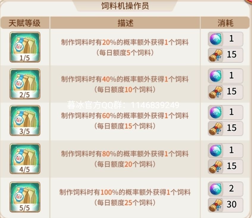 ⑤饲料机操作员:5级,制作饲料是100%额外获得一个饲料(每日限额25个)