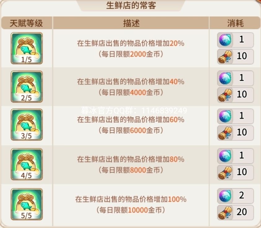 ③生鲜店的常客:5级,在生鲜店出售价格增加100%(每日限额1万金币)