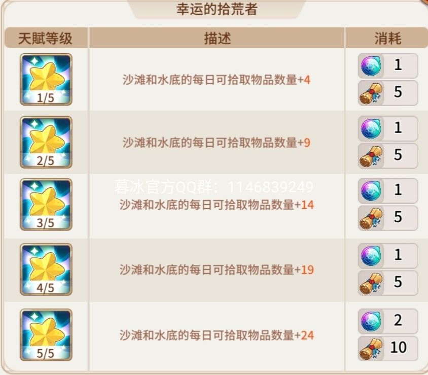 ①幸运拾荒者:5级,沙滩和海底每日可多获得25个物品