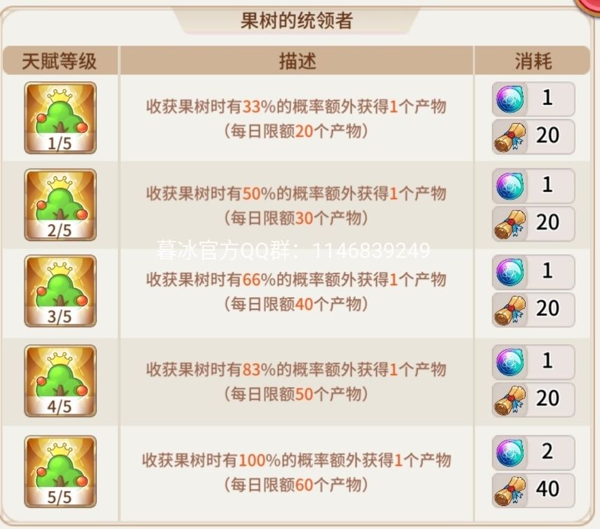 ⑥果树统领者:5级,收获果树有33%的概率额外获得一个果实(每日限额获得20个)
