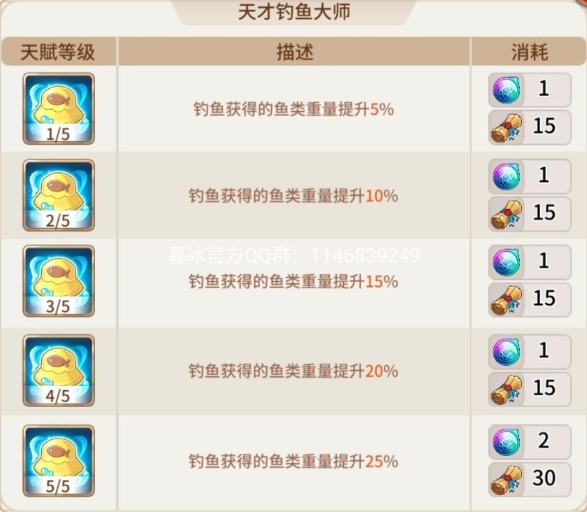 ④天才钓鱼大师:5级,钓起来的各种鱼类重量增加25%