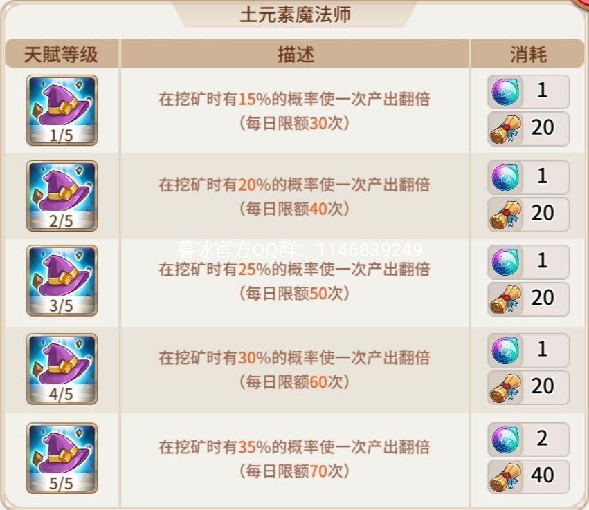 ⑥土元素魔法师:5级,挖矿时有35%的概率使一次收益变成双倍(每日限额70次)