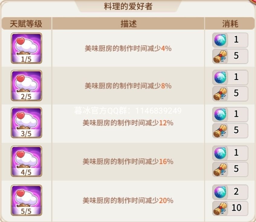 ①料理爱好者:5级,厨房食物制作时间减少20%