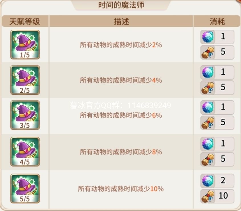 ①时间的魔法师:5级,所有动物成熟时间减少10%