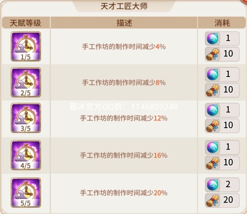 ⑥天才工匠大师:5级,发明工坊制作费用降低1400(每日限额14000金币)