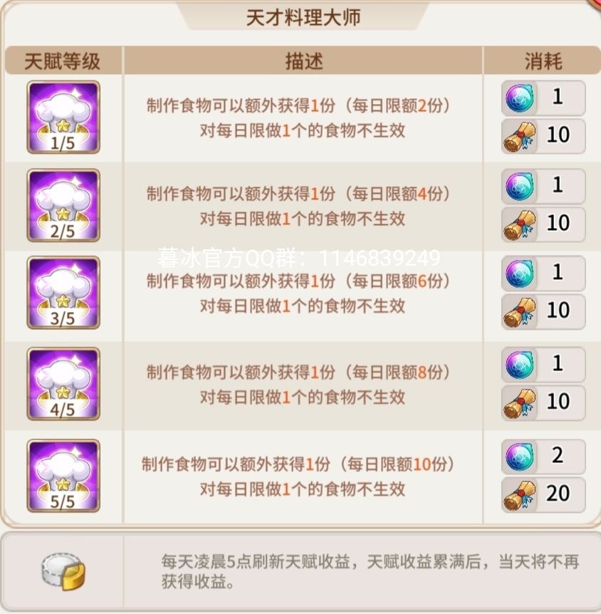 ②天才料理师:5级,每日制作食物可额外获得一份(每日限额十份),每日限定制作一次的食物不生效