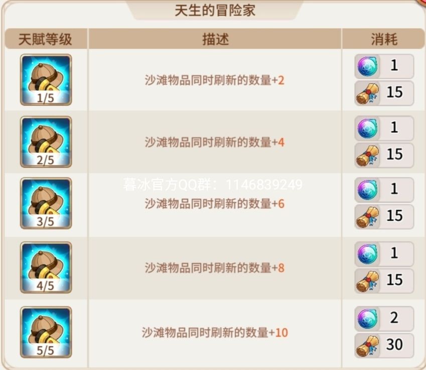 评价:鸡肋天赋,沙滩上每日刷新上限为45,这个天赋也就增加了出现速度而已