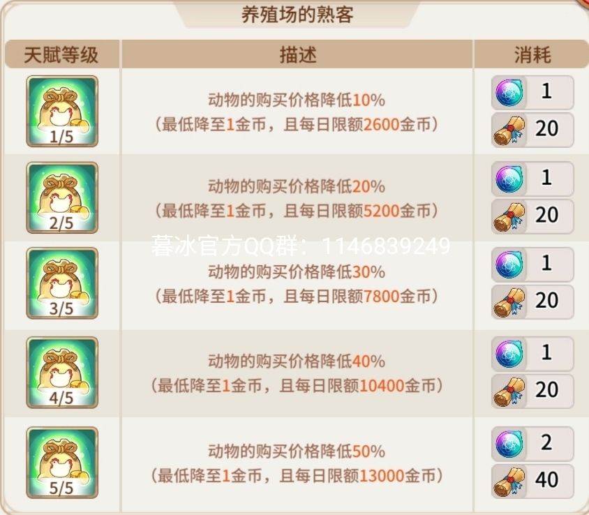 ⑥养殖场熟客:5级,动物购买价格降低50%(每日限额13000金币)