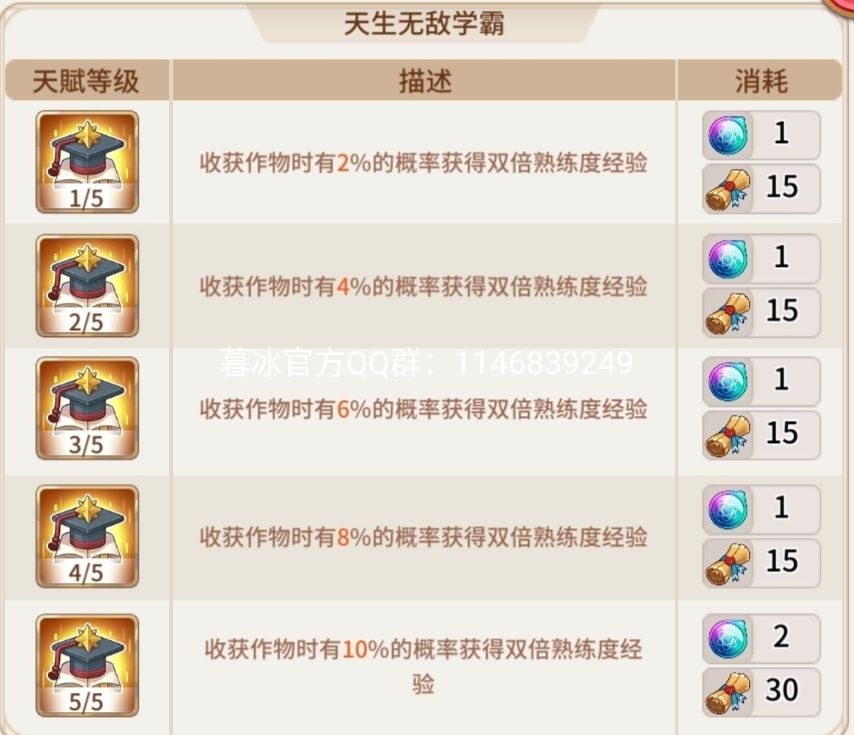 ④天生无敌学霸:5级,收割农作物时有最高10%的概率获取双倍经验